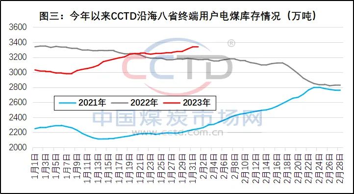 另一(yi)方面,今年(nián)12月7日,“CCTD沿海(hǎi)八省動力(lì)煤終端用(yòng)戶數據”所(suo)覆蓋發電(diàn)企業的電(dian)煤庫存為(wéi)3338.4萬噸、同比(bǐ)增加170.5萬噸(dun),處于近幾(jǐ)年同🐇期高(gao)位(見圖三(san)),當天的庫(ku)存可用天(tiān)數為21.5天,也(ye)處于偏高(gāo)狀态。